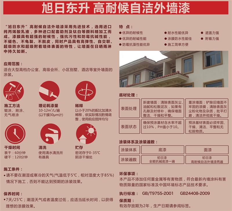 ““旭日东升”高耐候自洁外墙漆采用先进技术,选用进口纯丙烯酸乳液,多种进口配套助剂及钛白等颜料精加工而成。漆膜具有超强的耐候性,强抗污性和防霉抗碱性能,不褪色、不龟裂、不脱皮,同时产品具有高弹性、自交联、超级防水和超级附着墙体表面的特性.让墙面在日晒雨淋中持久如新。