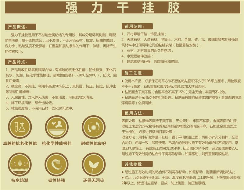强力干挂胶是用于石材与金属粘结的专用胶.其成分是环氧树脂,调配简单明确,属于柔性结合,且不渗油,不无污染石材,抗震、扭曲性能强,应力小,粘结强度不受影响,在温差和震动条件的作用下,伸缩、沉降产生的位移较小。