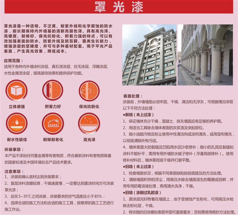 罩光漆是一种透明、不泛黄、耐紫外线和化学腐蚀的防水漆.能长期保持内外墙基的清新亮丽色泽。具有高光泽.高硬度.耐候好、保光抗粉化.附着力强的特点,可以有效加强表面的防水、防紫外线及防苔藓、菌类生长能力,增强涂层的坚硬度,并可与多种基材配套。用于平光产品表面,产生高光效果.降低成本。