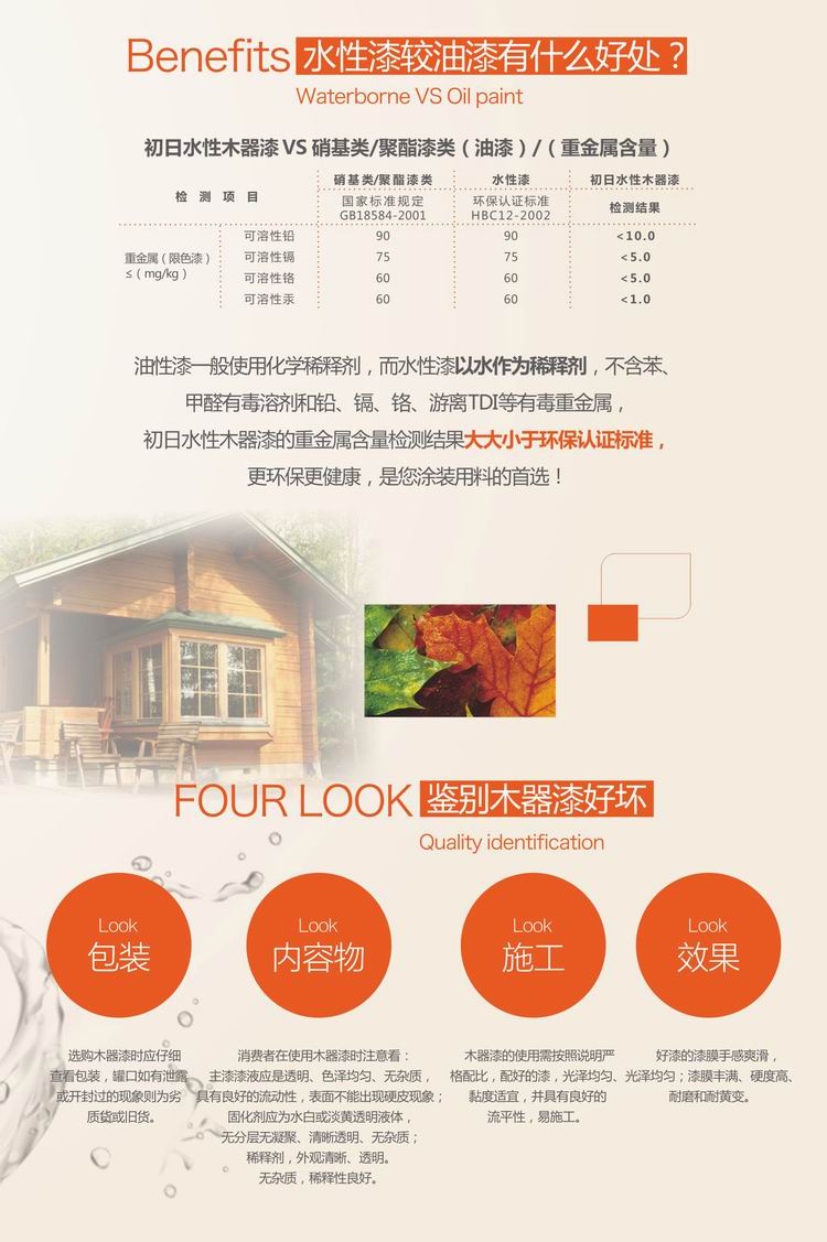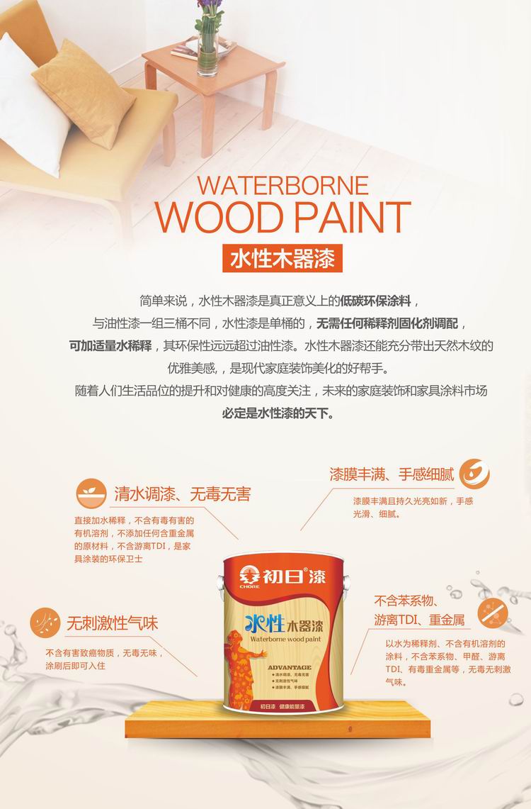 本产品采用最新涂料制备技术与先进水性树脂体系,添加了天然活性竹炭因子,能有效吸附并分解室内装饰材料释放的甲醛,净化苯类、酯类、酮类等各种挥发性有害物质,能营造空气持久森态清新的居住环境,在施工过程或施工后都不会产生刺激性气味,加倍呵护家人健康。该产品漆膜丰满,透明度高,能充分带出天然木纹的优雅美感,并具有优异的耐划伤性能。初日全能亮光木器清漆面漆是现代家庭室内装饰美化的首选。