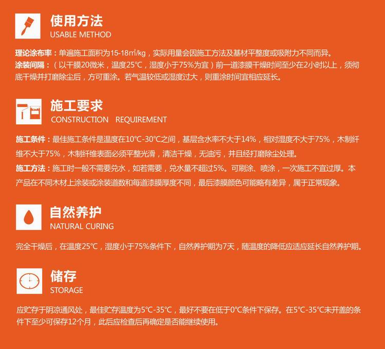 施工方式 刷涂、喷涂。通常在涂完每一道漆、待其干透以后,用600目以上砂纸轻轻打磨,除去表面的杂质后方可重涂。
