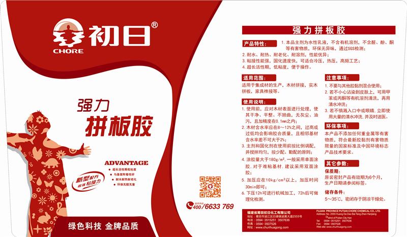 本品主剂为水性乳液,超长活性期,便于操作,固化速度快,可用在冷压,热压,高频工艺,适用于集成材的生产,木材拼接,实木拼板,家具榫接等。