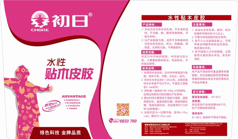 本品为乳白色水性乳液,粘结力强,适用于多种基材的冷压和热压帖合,耐水,耐酸碱,耐高温,干燥速度快,无有机污染。常用于木皮与中纤板的贴面,中纤板与防火板、三聚氰胺板的贴合,纸品贴合,中纤板加厚等。