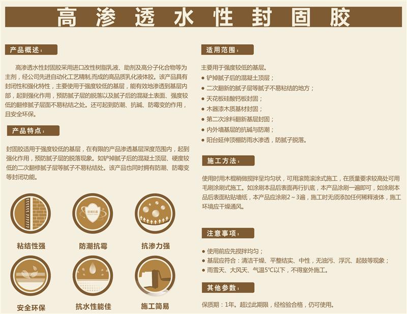 高渗透水性封固胶采用进口改性树脂乳液、助剂及高分子化合物等为主剂,经公司先进自动化工艺精制.而成的高品质乳化液体胶。该产品具有封闭性和强化特性,主要使用于强度较低的基层,能有效地渗透到基层内部,起到强化作用,预防腻子层的脱落以及腻子后的混凝土表面、强度较低的翻修腻子层面不易粘结之处。还可起到哳朝、抗碱、防霉变的作用,且安全环保。