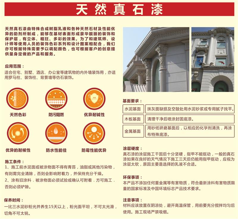 天然真石漆由特殊合成树脂乳液和各种天然石材及性能优异的助剂所制成,能够在基材表面形成豪华靓丽的装饰和保护层,有立体、粗狂、多彩的效果。为了和建筑师、设计师等使用人员的装饰色彩系列和设计图案相配合,我们亦可根据特殊需要予以调配颜色,也可根据客户的创意提供量身定做的产品和服务。